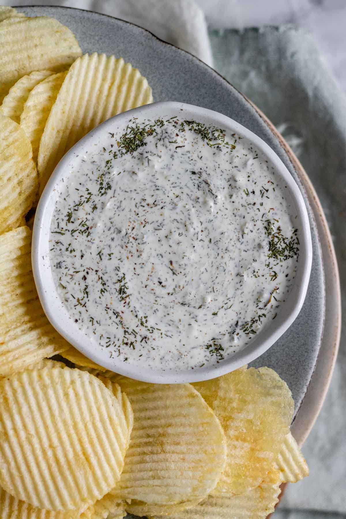 An herby dip in a bowl on a plate with chips with the text dill pickle dip.