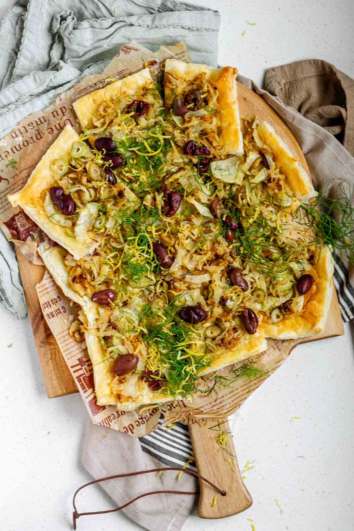 A crisp puff pastry tart topped with caramelized fennel, onion, olives, and bright lemon. Simple, elegant, and easy for beginners.
